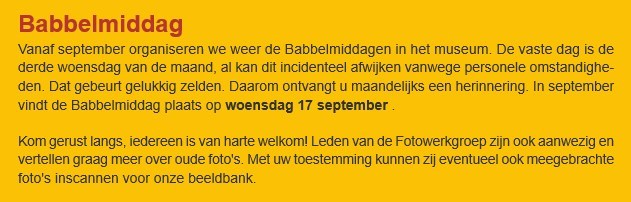 Heeft u zin in een middag vol verhalen en gezelligheid? Kom dan langs tijdens onze Babbelmiddag! De vaste dag is de derde woensdag van de maand. In oktober vindt de Babbelmiddag plaats op woensdag 15 oktober. Kom dan gerust even langs – iedereen is van 14:00 tot 16:00 uur van harte welkom in ons museum aan de Westkanaalweg 118 in Ter Aar.